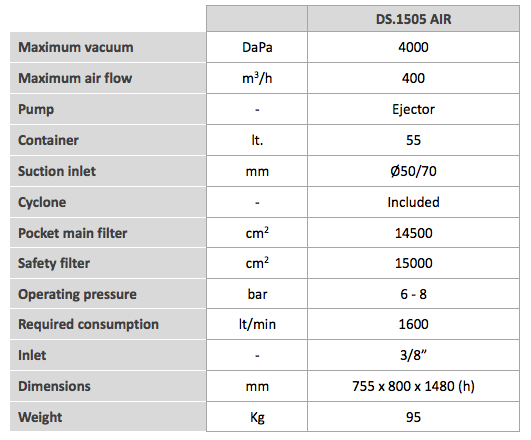 The DS1505 version powered by compressed air is equipped with a Venturi suction pump, offering the possibility of use where electricity is absent or forbidden (ATEX zones, etc.).