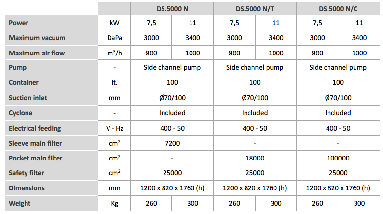 DS5000 is equipped with a side channel pump turbine protected by a solid steel frame. Available with different filtering solutions (sleeve, pocket or cartridge). With the addition of a float switch in the container, the vacuum is ideal for collecting liquids.