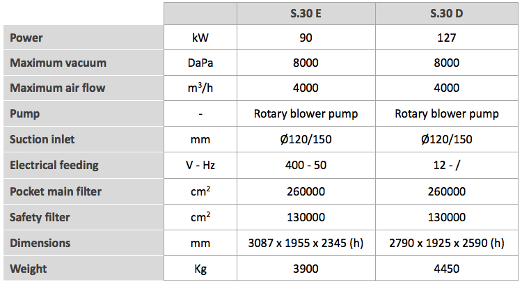 S30 is a high performance vacuum designed for the recovery and transport of large quantities of product. Available with a powerful Diesel or electric motor. The wide range of pre-separators and silos to which it can be combined increases its versatility.
