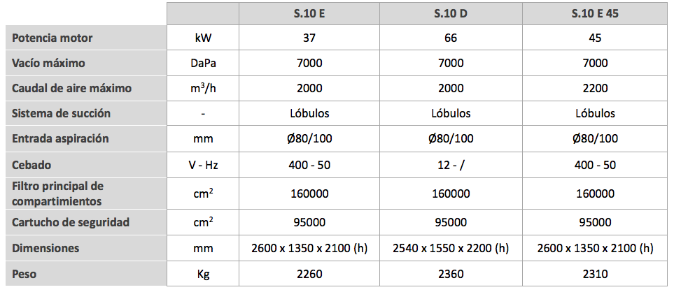 El modelo S10 garantiza un perfecto equilibrio entre el caudal de aire y la aspiración, ofreciendo la posibilidad de una configuración entre dos motores eléctricos y uno diésel. Combinado con un preseparador de recogida, el modelo S10 es la solución ideal para cualquier exigencia de aspiración gravosa.