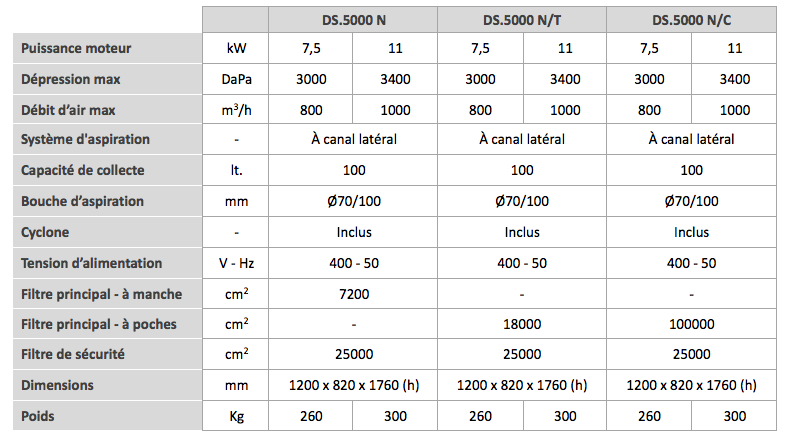 DS5000 est doté d’une turbine à canal latéral, protégée par un châssis en acier solide. Disponible avec différentes solutions de filtration (à manche, poches ou cartouche). Il convient parfaitement à la récupération de liquides au moyen de l’ajout d’un flotteur dans le récipient.