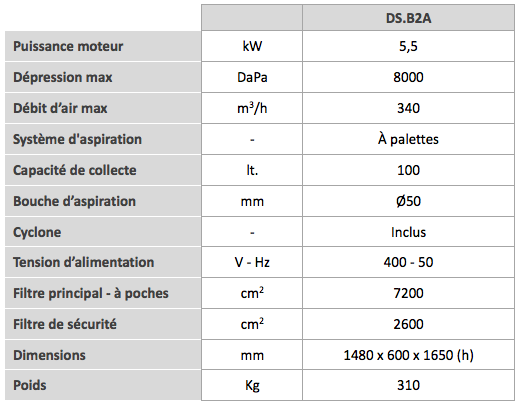 DSB2A est le modèle à haut vide de la gamme DS, conçu pour aspirer en conditions de travail extrêmes. Comme toutes les unités de la série DS, il est doté d’un cyclone séparateur, d’un bidon de récupération et d’un double système de filtration : DSB2A n’a rien à envier aux modèles de taille et de puissance supérieures.
